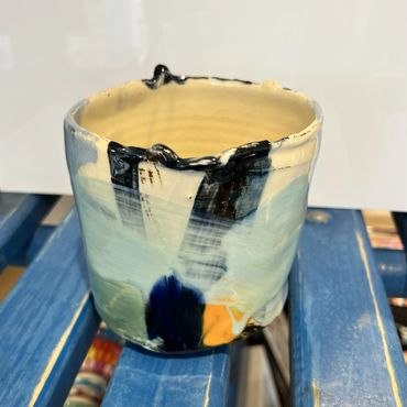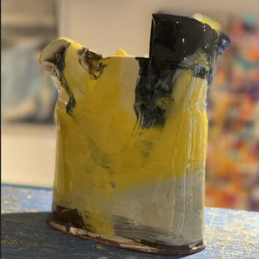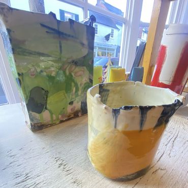 My Intention as a ceramic artist is to make colourful, dynamic forms that come out of a deep connection to the landscape. Often my work is rooted in the directness and urgency of drawing outside; responding to the weather, drama, and life which surrounds my garden studio by the river Flit in Bedfordshire. Starting on the wheel or constructed with slabs, the red earthenware vessels are marked and altered, scored and handled, before being painted with layers of coloured slips and oxides, washes of vivid colour enhanced with a bright rich clear glaze. The vessels are the offered to the kiln in an open dialogue of transformation; fired to 1100 degees and infused with the marks, rhythm and energy of their making.